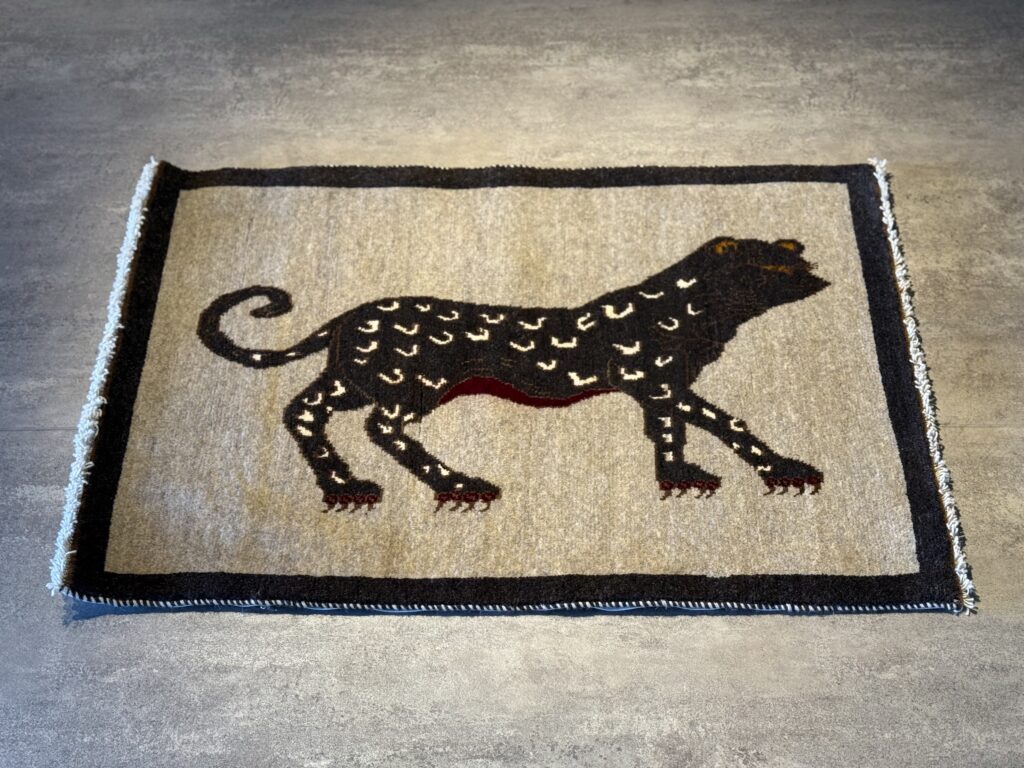 手織りならではの素朴な風合いが、ヒョウの持つ力強さに、どこか愛らしさを添えているようです。