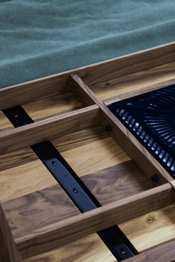 重厚感のあるデザインながら、長辺側は幕板を斜めにカットすることで、座卓として使用しても窮屈にならないよう工夫しました。