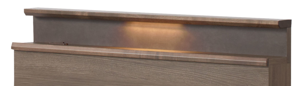 天然無垢材のヘッドボードには、ホテルのような雰囲気のあるダウンライトと充電器に便利なコンセントが付いています。
