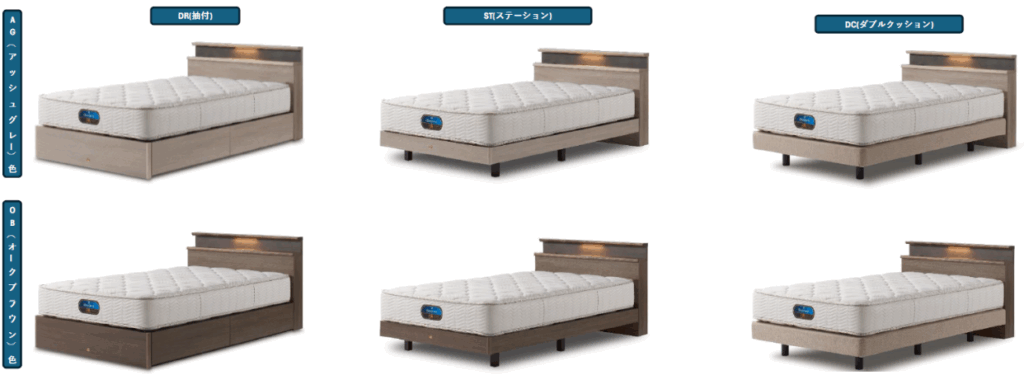 シンプルながら木質感をたっぷり感じる事のできるベッドです。ユーザー様にお選びいただきやすいように2つのカラー、3つのボトムのセレクトも充実。ステーションタイプ、引出付き、ダブルクッションタイプからお選びいただけます。