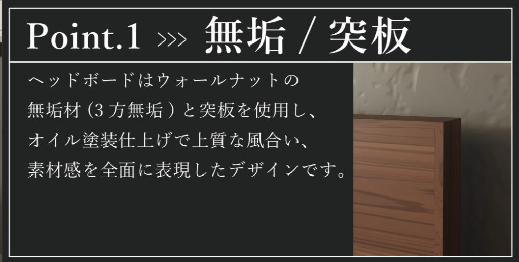 ヘッドボードはマスターウォールオリジナルのウォールナット無垢材と突板を使用し、綺麗で高級感のある仕上がりとなっています。