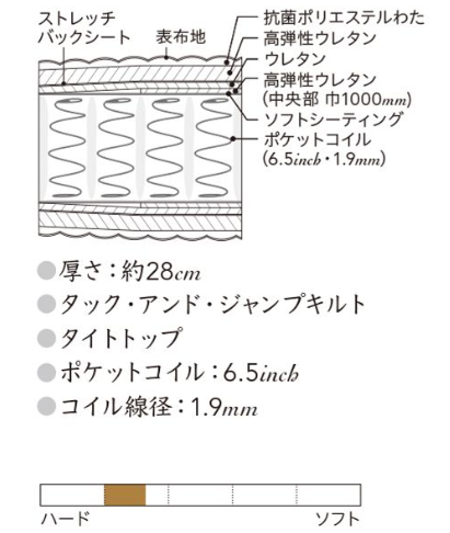 6.5インチポケットコイル(線径1.9mm)を使用しています。多くのご支持をいただくシモンズのベストセラーマットレスです。程良い硬さとクッション性でポケットコイルのサポートを感じられる、ベーシックなマットレスです。