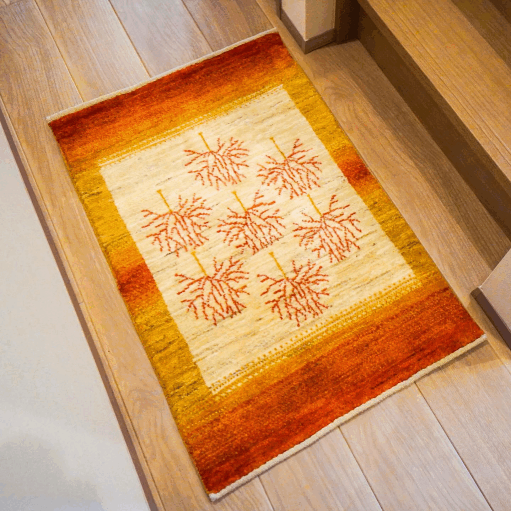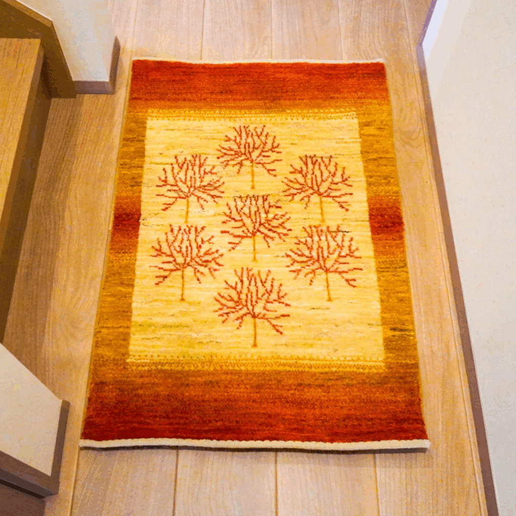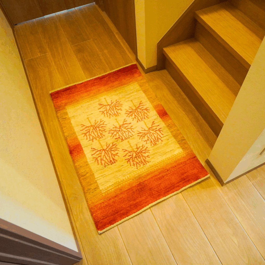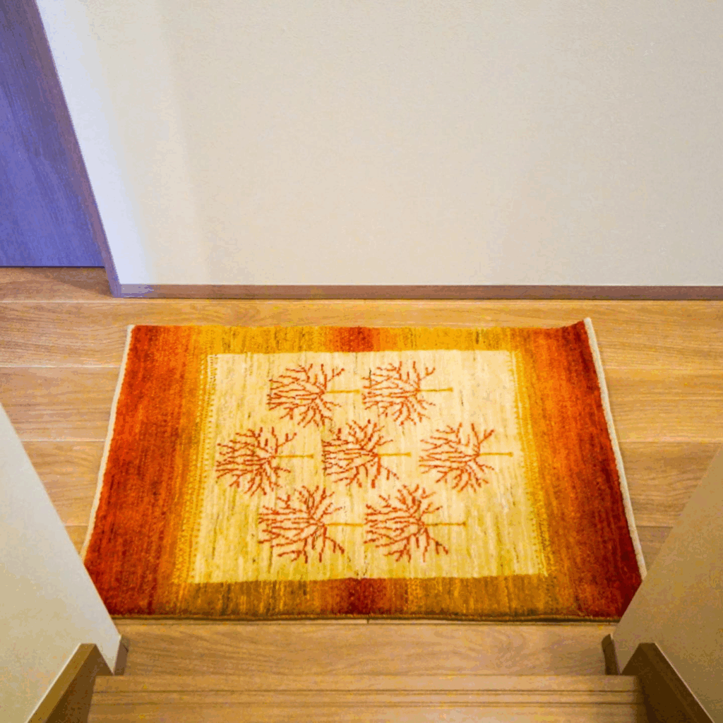 ギャッベあるお住まいをご紹介させて頂きます。階段下にギャッベを敷いた雰囲気です。秋冬の寒い時期でも足元があたたかく、気持ちを明るくさせてくれる一枚です。