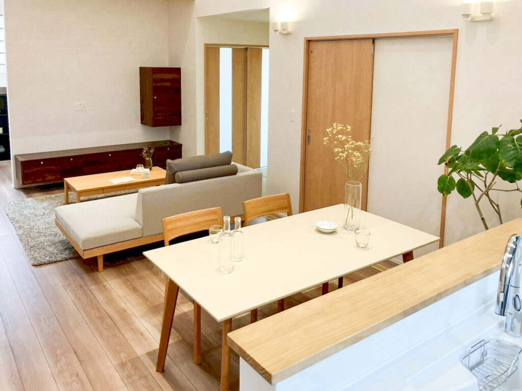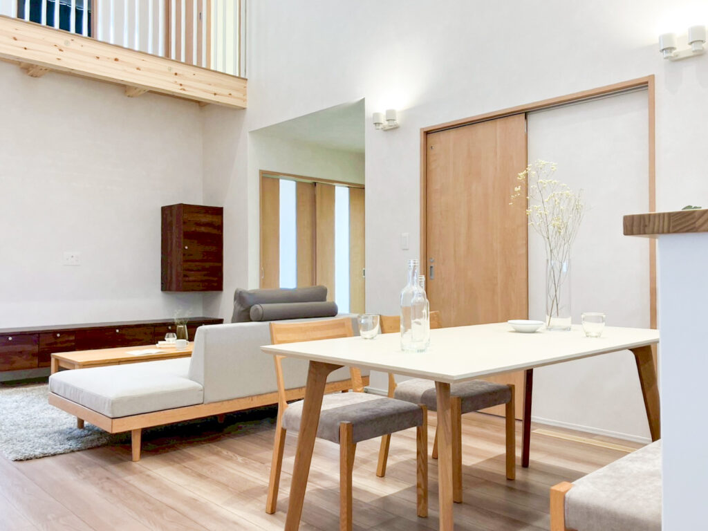 ゆるやかな片流れ屋根と落ち着いた外観が印象的な平屋風4LDKのお住まいです。南側には大きな窓と吹抜、グレーチングを設けた明るいLDKは家族が自然と集まる心地よい空間となっています。