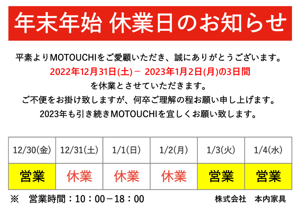弊社 本内家具は、2022年12月31日(土)~ 2023年1月2日(月)の3日間を休業とさせていただきます。