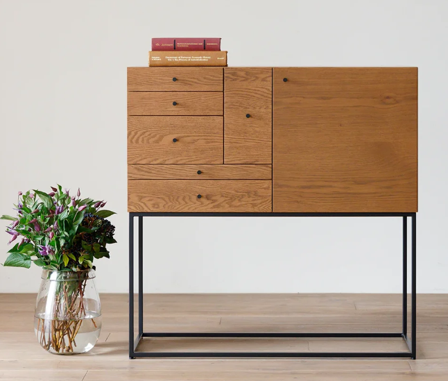 すっきりとしたスチール脚がシャープな印象を与えるサイドボードです。