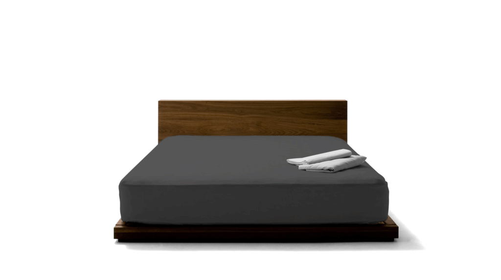 空間が広く感じられるロータイプベッド。本や眼鏡などの小物を置けるヘッドボード。最高グレード「マスターグレード」の無垢材を使用したフレーム。