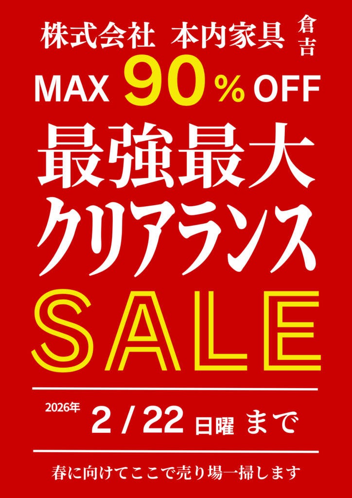 2026年2月13日金曜日より在庫一掃処分『最強最大!クリアランスセール』を開催させて頂きます。