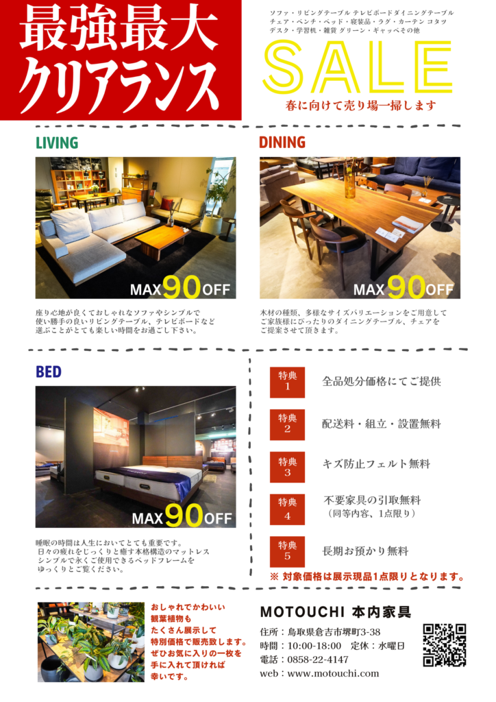 この春に向けて、今の展示品と在庫品を一掃クアリアランス価格とさせて頂きます。この機会に皆様のお越しをお待ちしております。